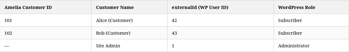 Amelia maintains its own internal user table, separate from the WordPress user system. To bridge the two systems, each Amelia customer record contains a field called **externalId**, which stores the corresponding WordPress user ID. This mapping is what allows Amelia to synchronize profile changes—including password updates—between its own system and WordPress.