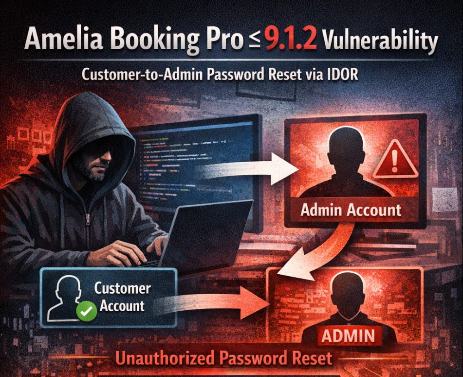 An authenticated privilege escalation vulnerability was discovered in Amelia Booking Pro ≤ 9.1.2 (CVE-2026-2931) that allows a low-privileged Amelia customer to reset the password of arbitrary WordPress users, including administrators, under common configurations.