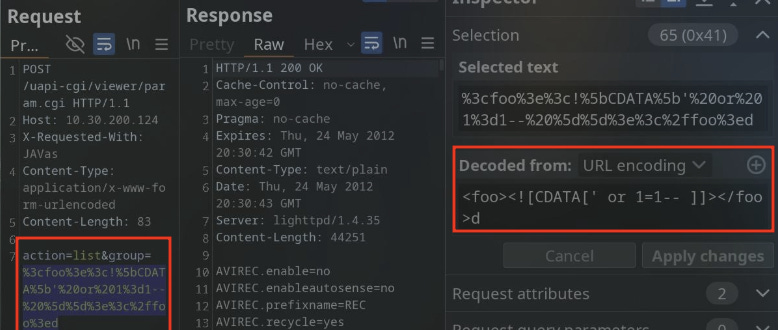What makes this injection interesting is that the injected value uses a URL-Encoded XML CDATA block inside of the groups’ value. The purpose of using a CDATA block is to tell the XML parser to treat the content as raw data, and escape any special characters (e.g., <, >, &,’ , ") that could potentially break the parser.