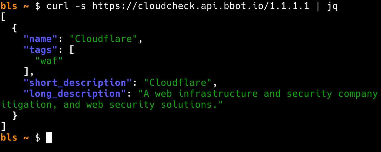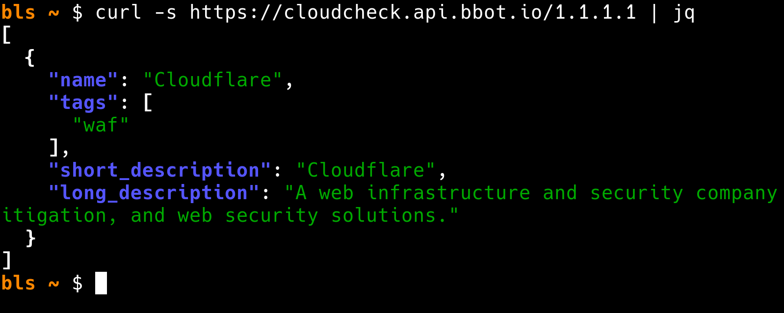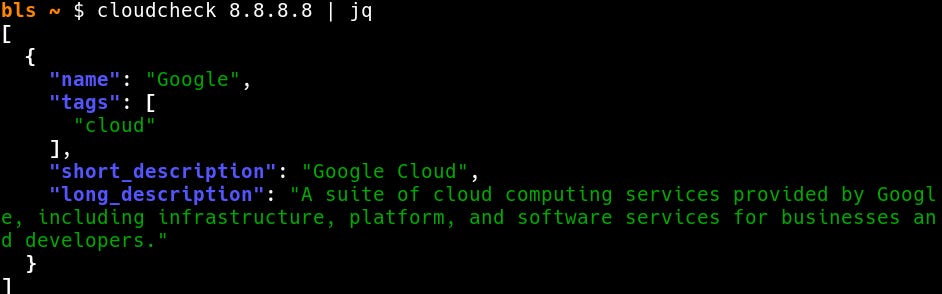 cloudcheck <hostname or ip>Output is JSON: