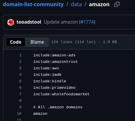 For domains, instead of hardcoding domains like “amazonaws.com”, it pulls daily from domain-list-community. This not only helps to keep the domain lists up-to-date and avoids manual maintenance, but also enables detection of child entities — for example, Kindle and Audible domains nested underneath Amazon: